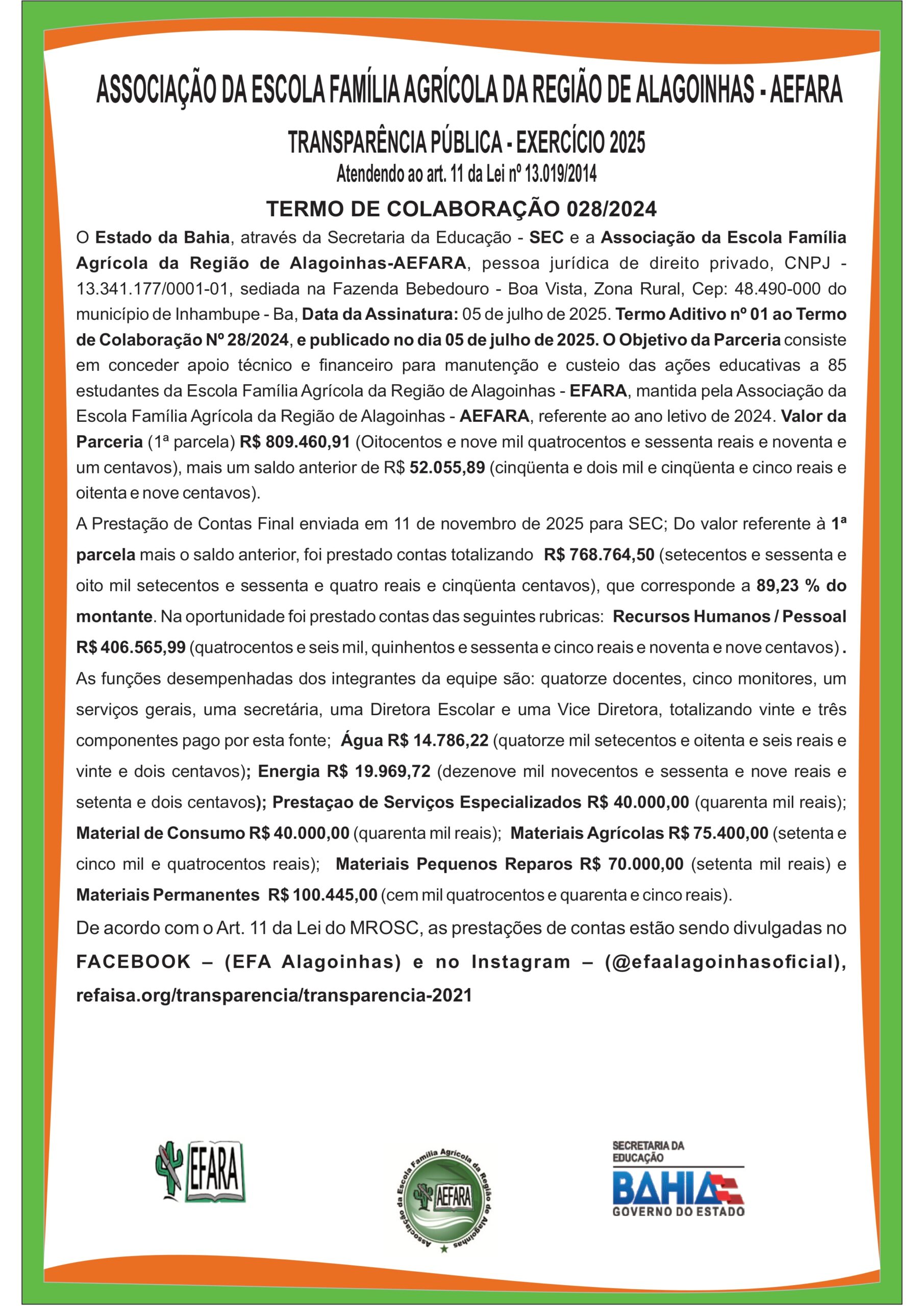 PRESTAÇÃO DE CONTAS/TRANSPARENCIA - Associação Regional da Escola Família Agrícola de Itiúba – AREFAI - Termo de Colaboração nº 13/2024 – SEC/AREFAI - 2ª Parcela - Republicação